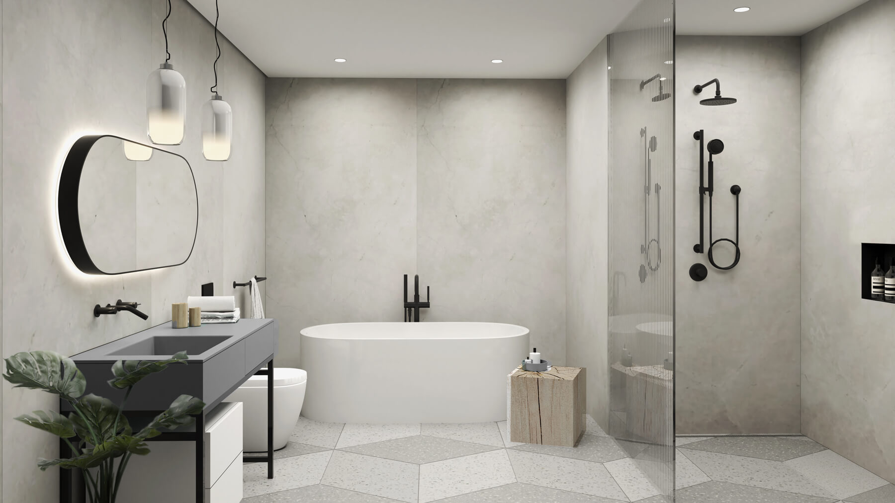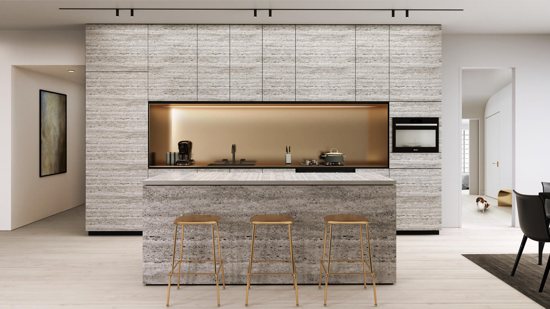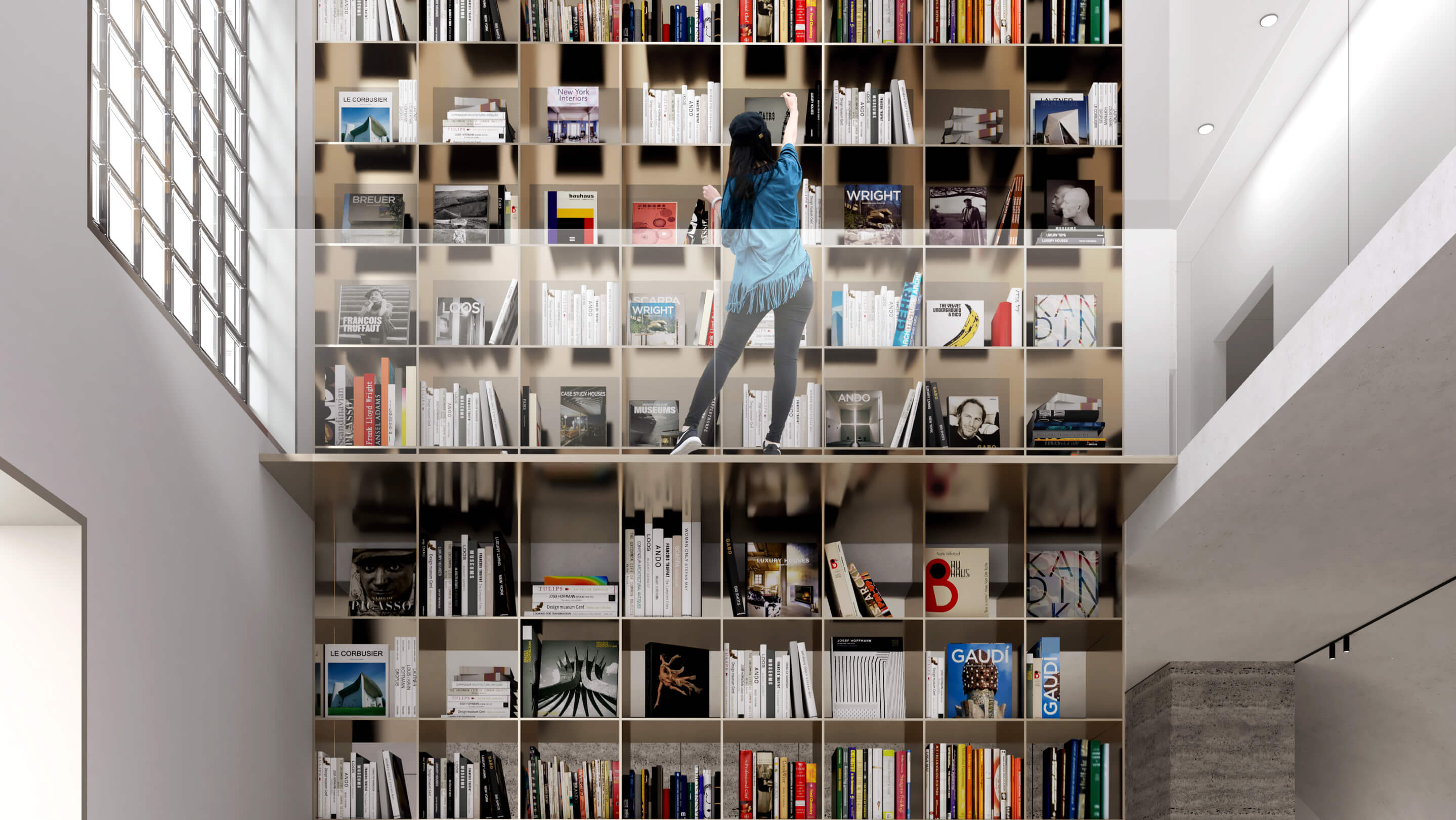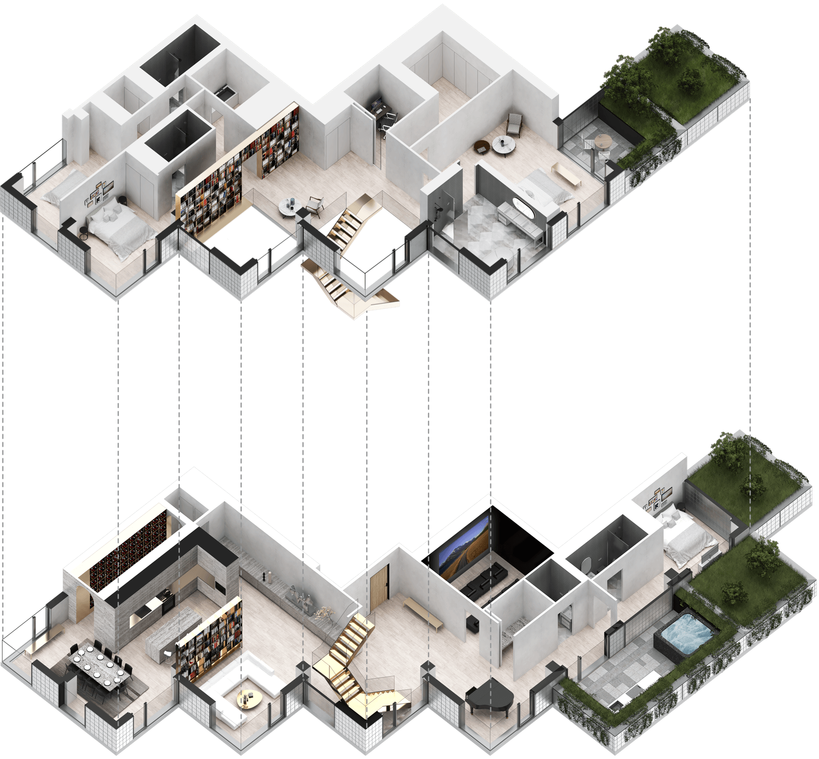 Architectural details inspired by the light and futuristic design language of Eero Saarinen lend the West Mountain Penthouses a unique character. In La Bibliothèque, custom brass details and uplights accentuate the special moments throughout, from an arched wine cellar to a custom brass bookshelf connecting two floors, featuring a library curated by Taschen Books. A multitude of outdoor terraces allow residents to soak up the setting sun in the evenings and watch as the sumac trees create dancing shadows on the curved and arched interior walls.