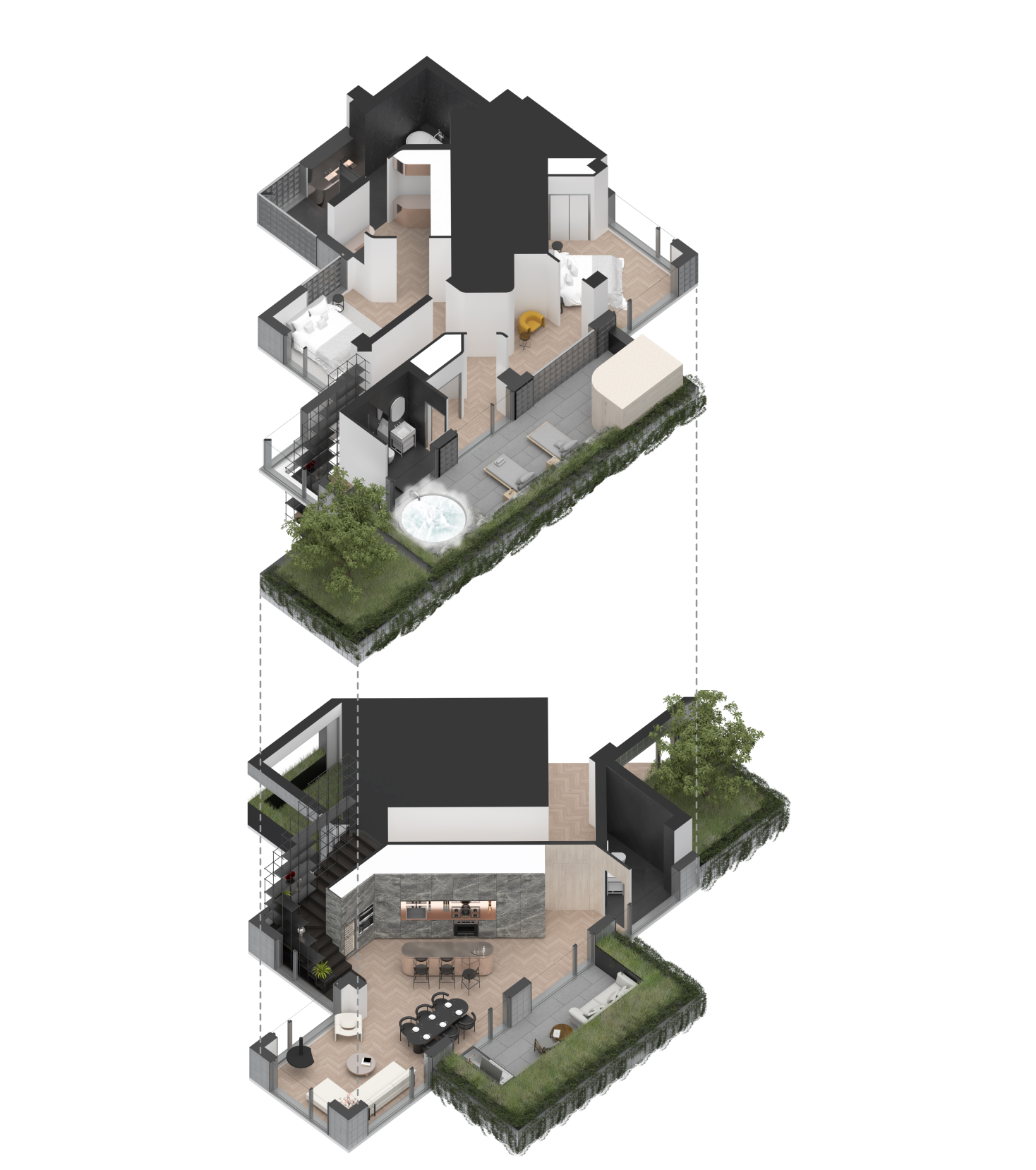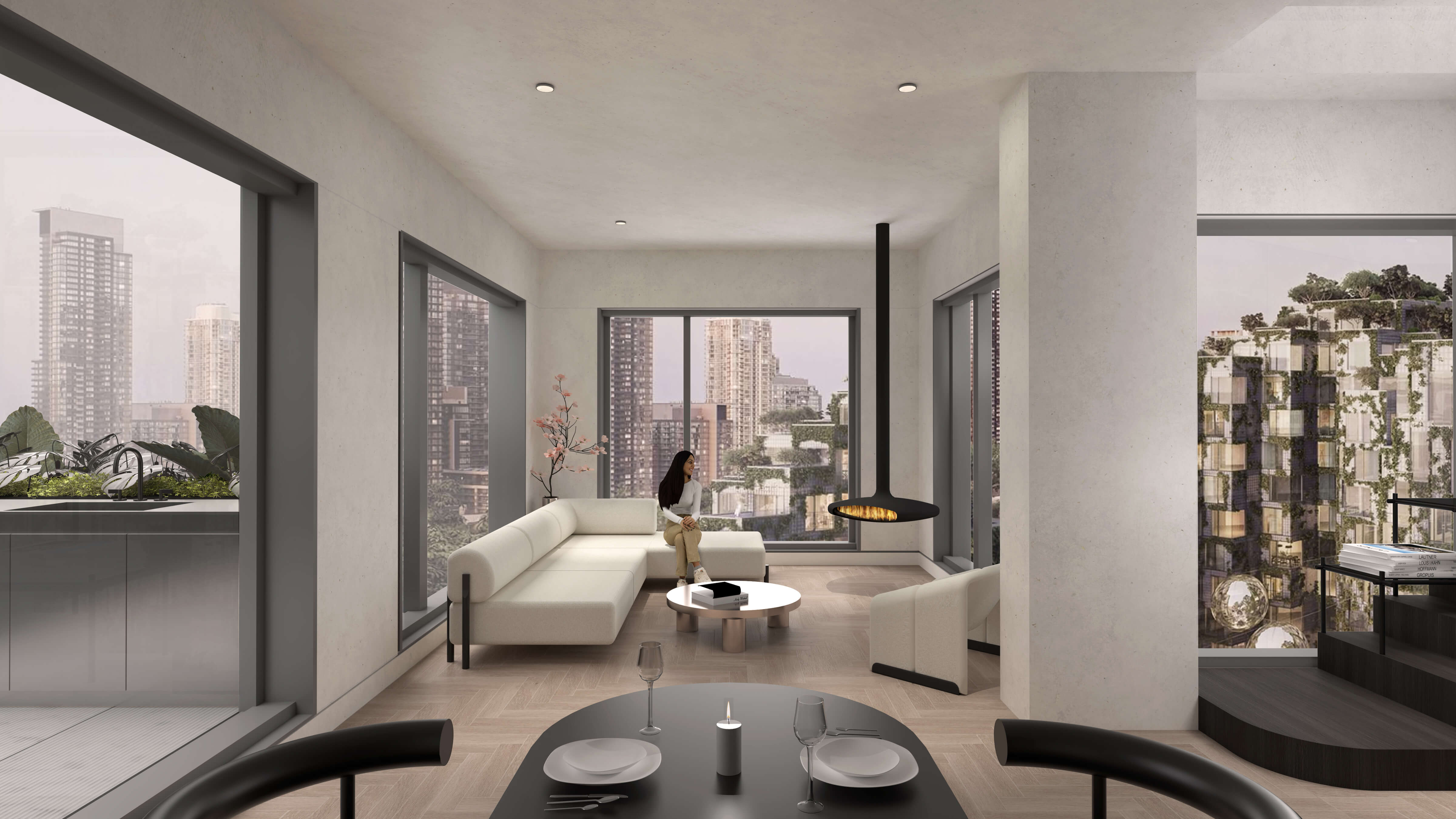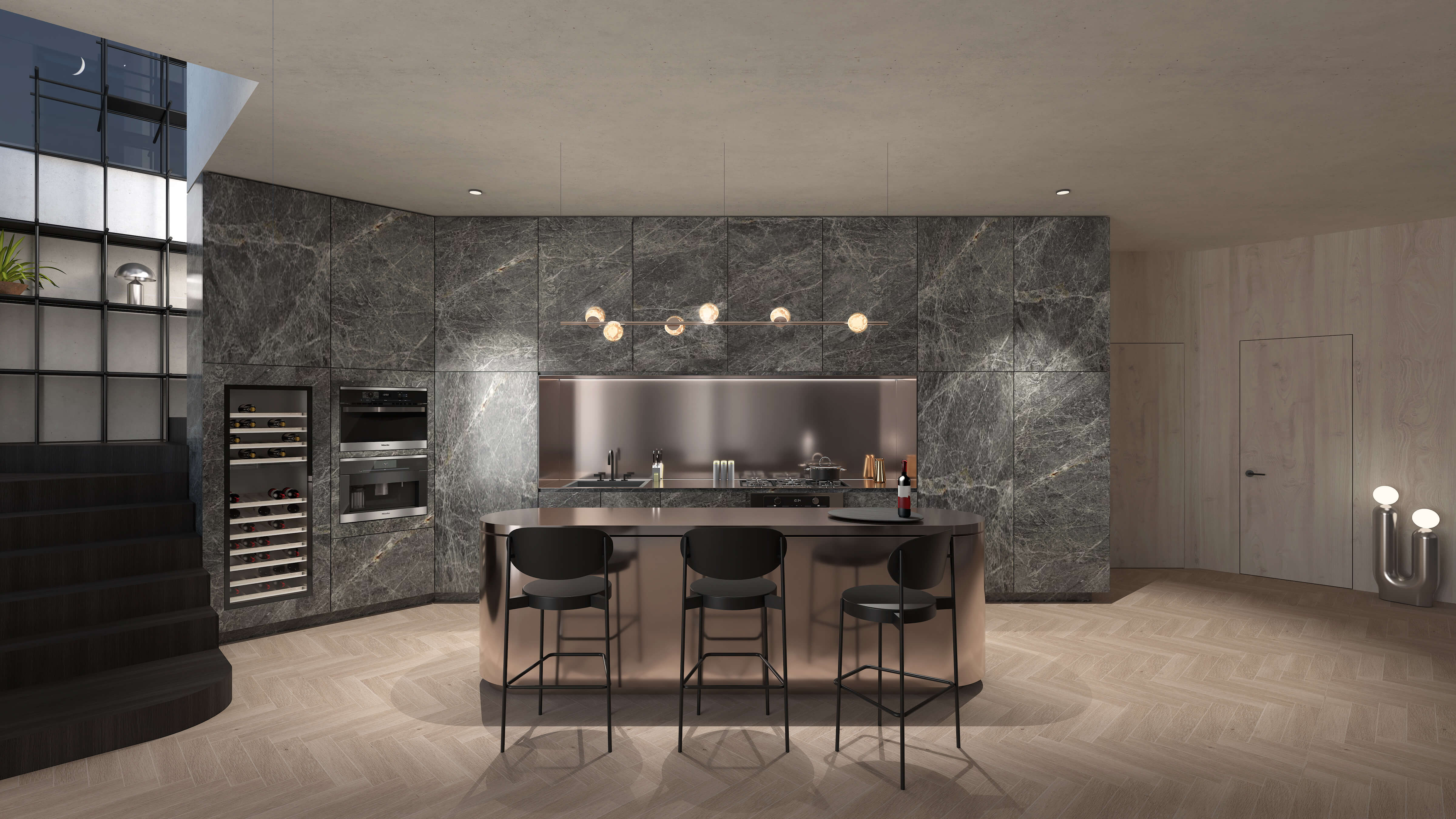 The Sanctuary is light-filled and open, with a beautiful luminosity throughout created by multiple walls of glass block. Soft whitewalls and warm oak flooring complement dark accents: a blackened steel floating fireplace and deep grey marble kitchen cabinetry and a black oak wood feature staircase with custom blackened steel shelving.