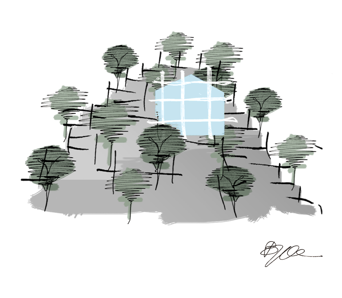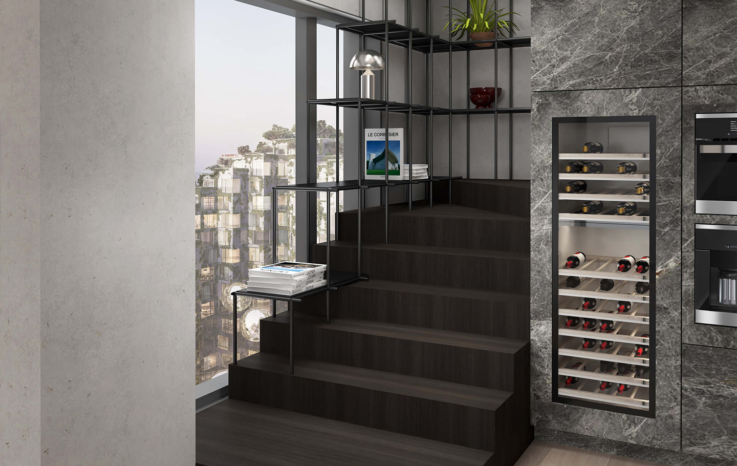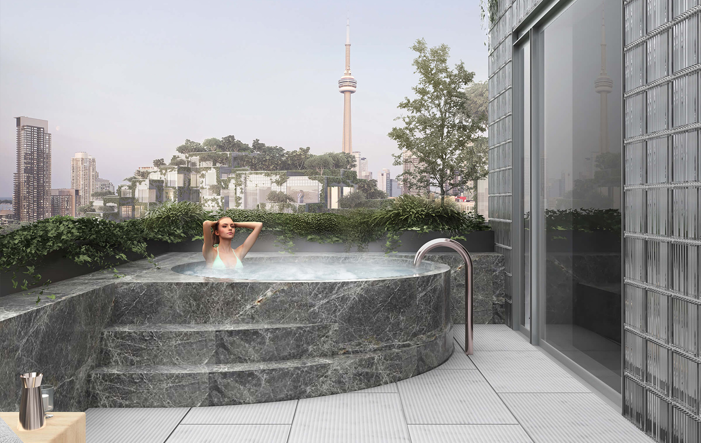 The Sanctuary is light-filled and open, with a beautiful luminosity throughout created by multiple walls of glass block. Soft whitewalls and warm oak flooring complement dark accents: a blackened steel floating fireplace and deep grey marble kitchen cabinetry and a black oak wood feature staircase with custom blackened steel shelving.